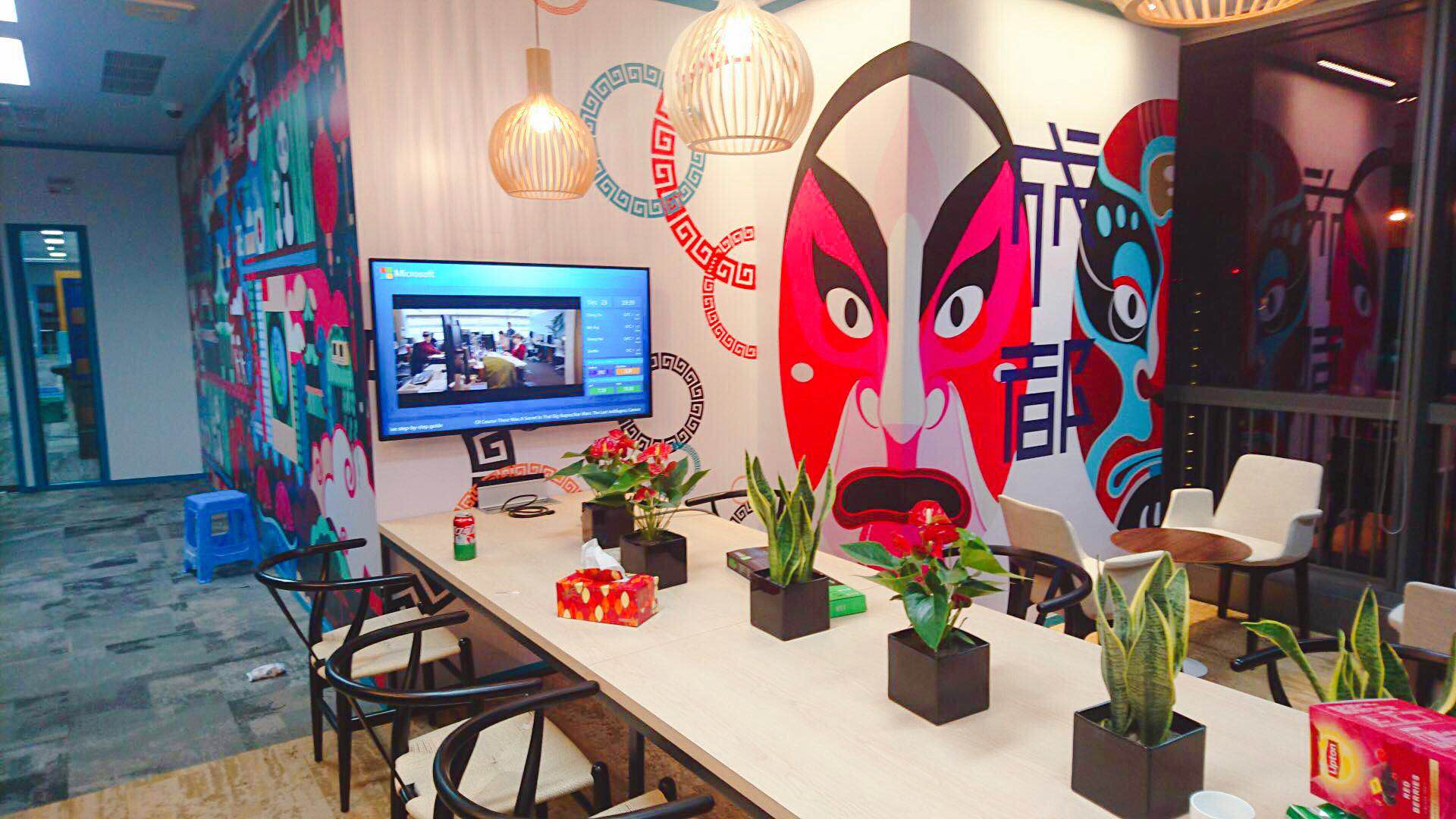 金橋不僅為微軟傾心打造了智能化的高科技會(huì )議室,而且充分結合當地的風(fēng)土人情和元素,打造了輕松休閑的hub space,會(huì )議之余,繼續頭腦風(fēng)暴。例如微軟成都的臉譜、熊貓、竹子和太極八卦,徹頭徹尾的“成都范兒風(fēng)格”;微軟福州的中國風(fēng)墻面,現代化與城市特色完美結合,極大地增加了愉悅高效的會(huì )議體驗。